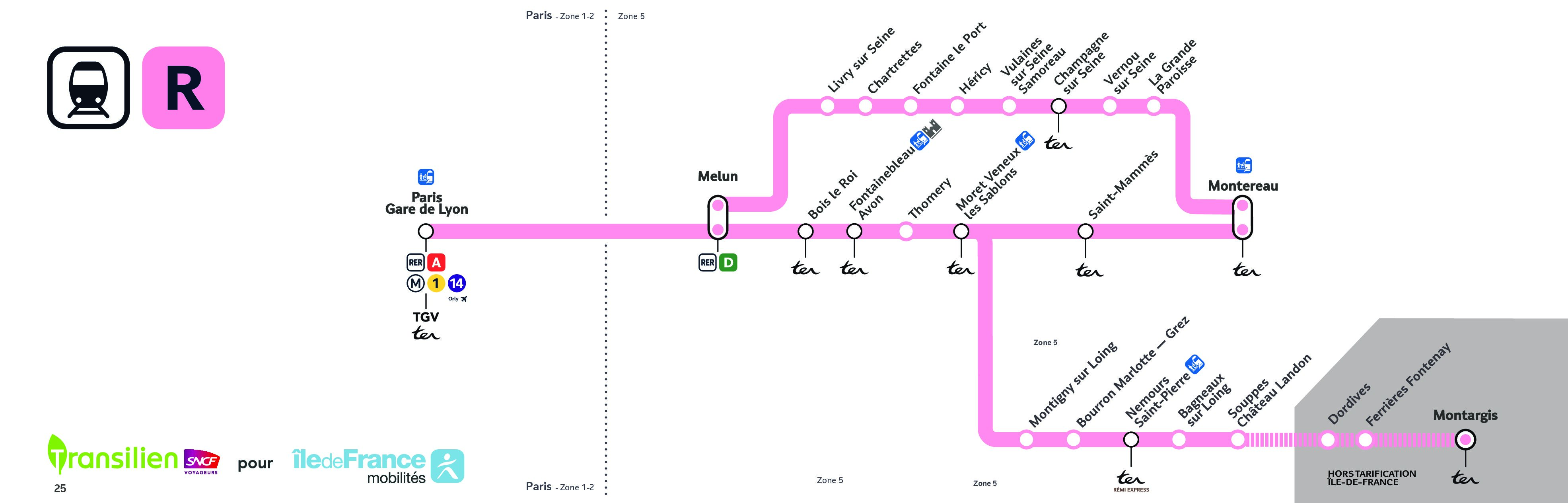 Le Transilien R relie Paris-Gare de Lyon à plusieurs destinations de la région sud-est de l’Île-de-France, notamment Melun, Montereau, Montargis et Moret-Veneux-les-Sablons.